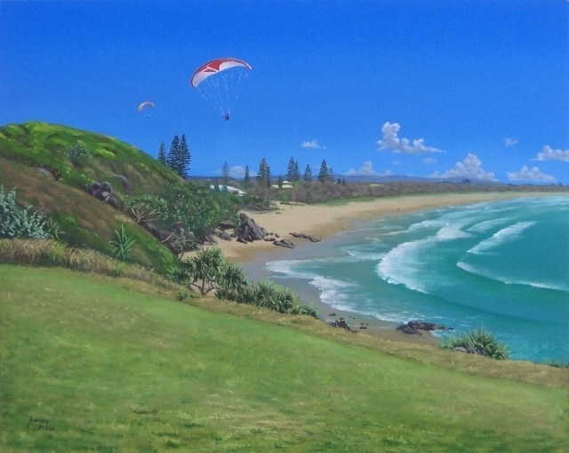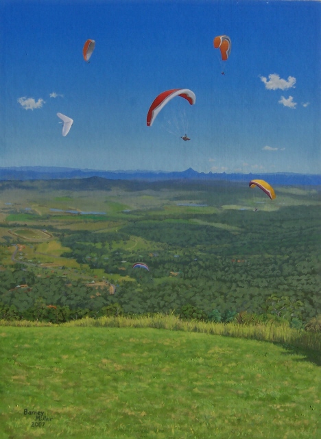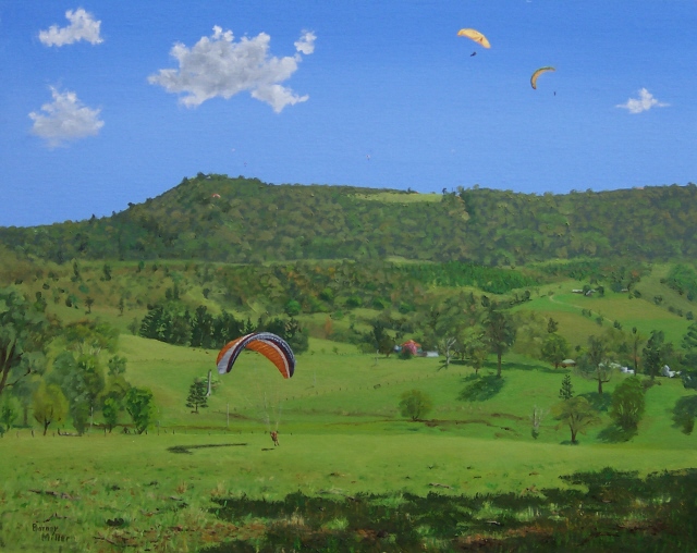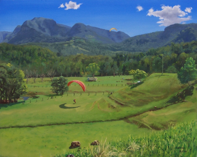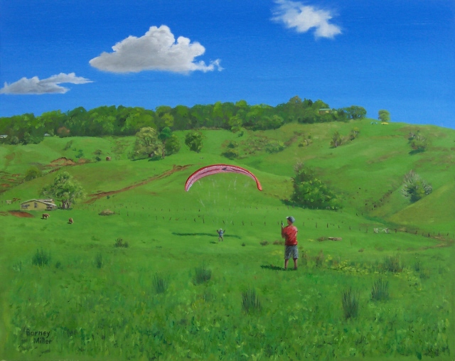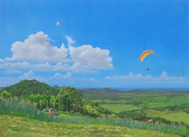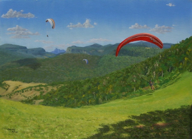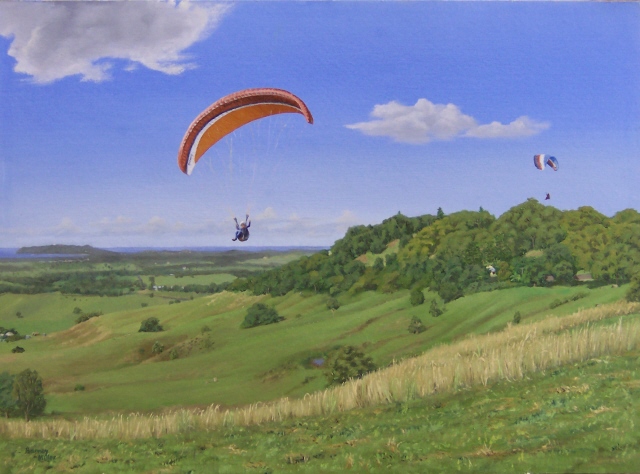 I have combined my two favourite interests to produce this series of landscapes with paragliders. The gliders add a splash of contrasting colour to the natural beauty of the scenery. (All of these paintings were painted in “plein air” style, on location, except for the last two, which were painted from memory.)